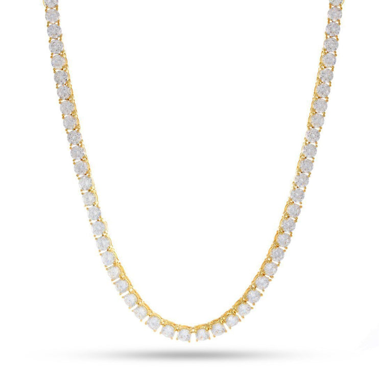 Providing a thin, sophisticated look is this 3mm Single Row Tennis plated chain. Each includes a single row of clear, round-cut CZ stones that pop in any sunlight, while each stone comes placed on a prong setting for added security and durability. The chain is available in multiple lengths.
