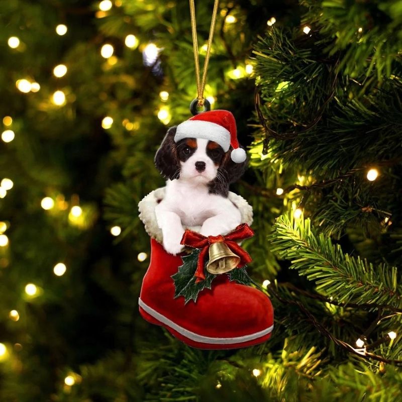 Cavalier King Charles Spaniel Black Triclor In Santa Boot Christmas Hanging Ornament SB143
