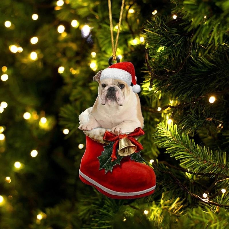 English Bulldog White In Santa Boot Christmas Hanging Ornament SB183