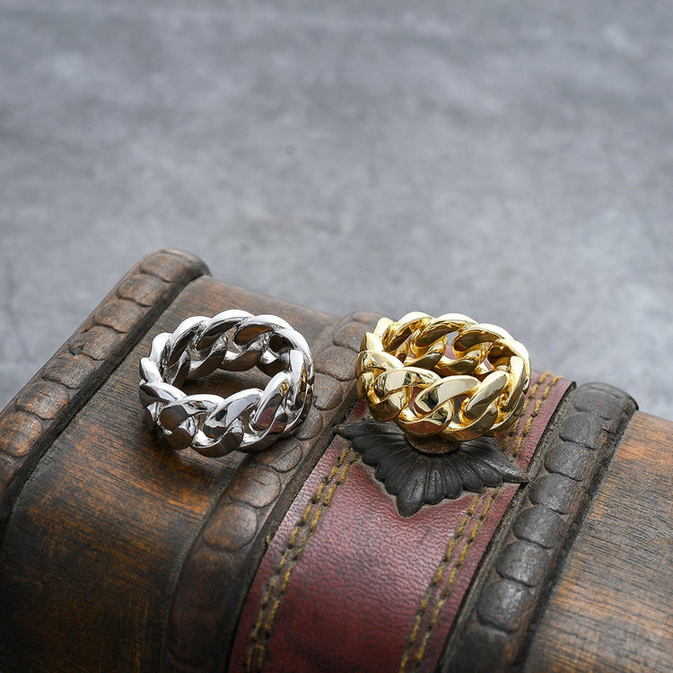 Introducing the Cuban Band Ring, this ring is inspired by our Cuban Link chains. The chain link design makes this ring very easy to wear and combine with all of your cubans. Our Cuban Band Ring can be stacked or worn alone and is the perfect ring to make a subtle statement.