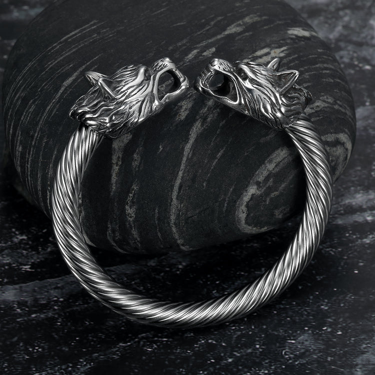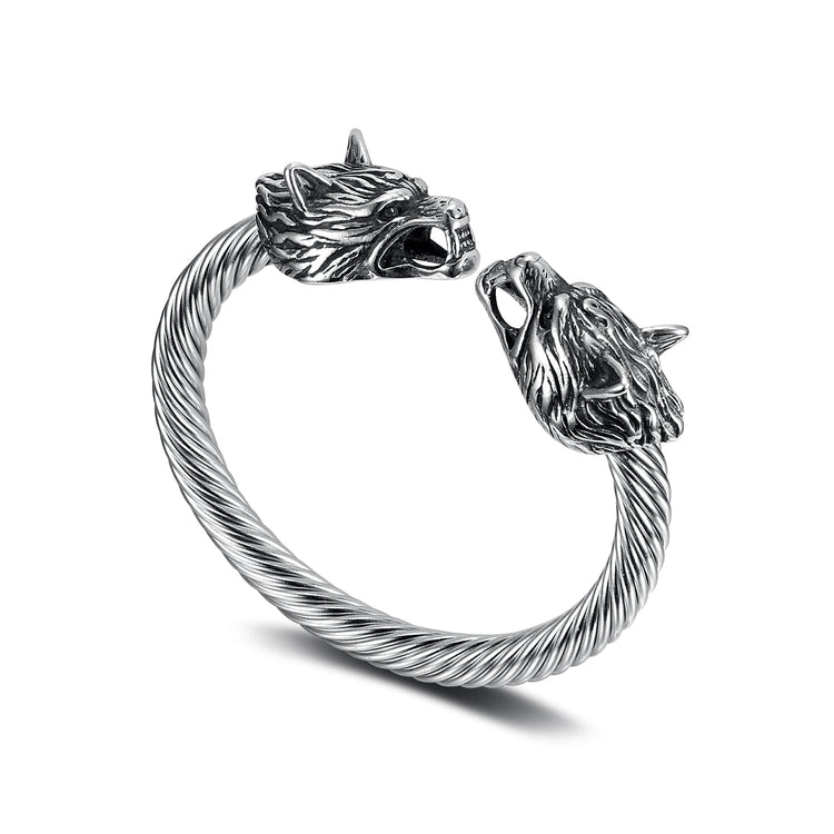 Nordic Pride Handcrafted Stainless Steel Large Grey Wolf Head Torc Bracelet