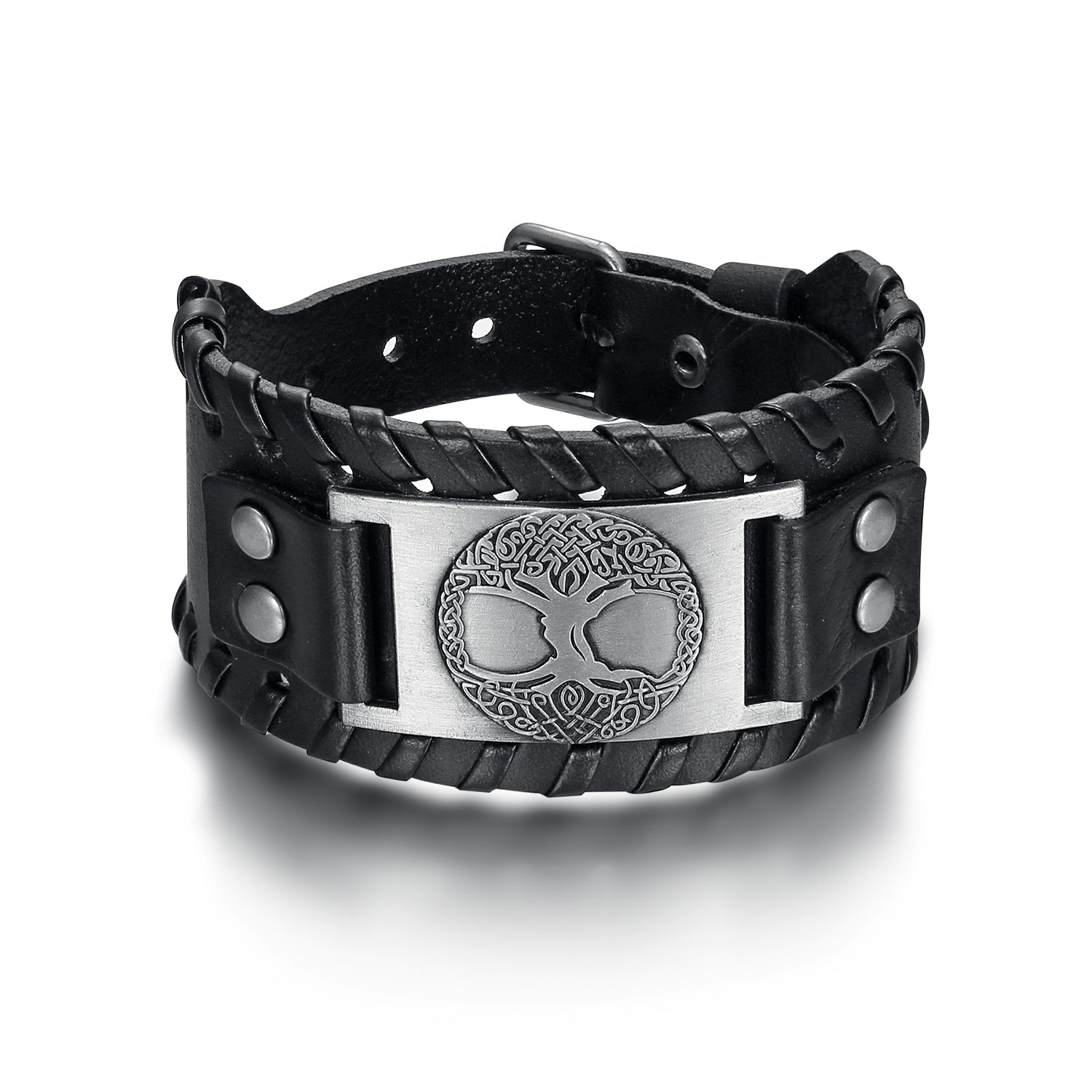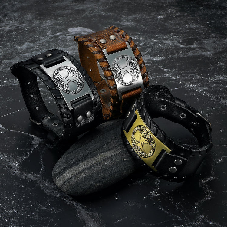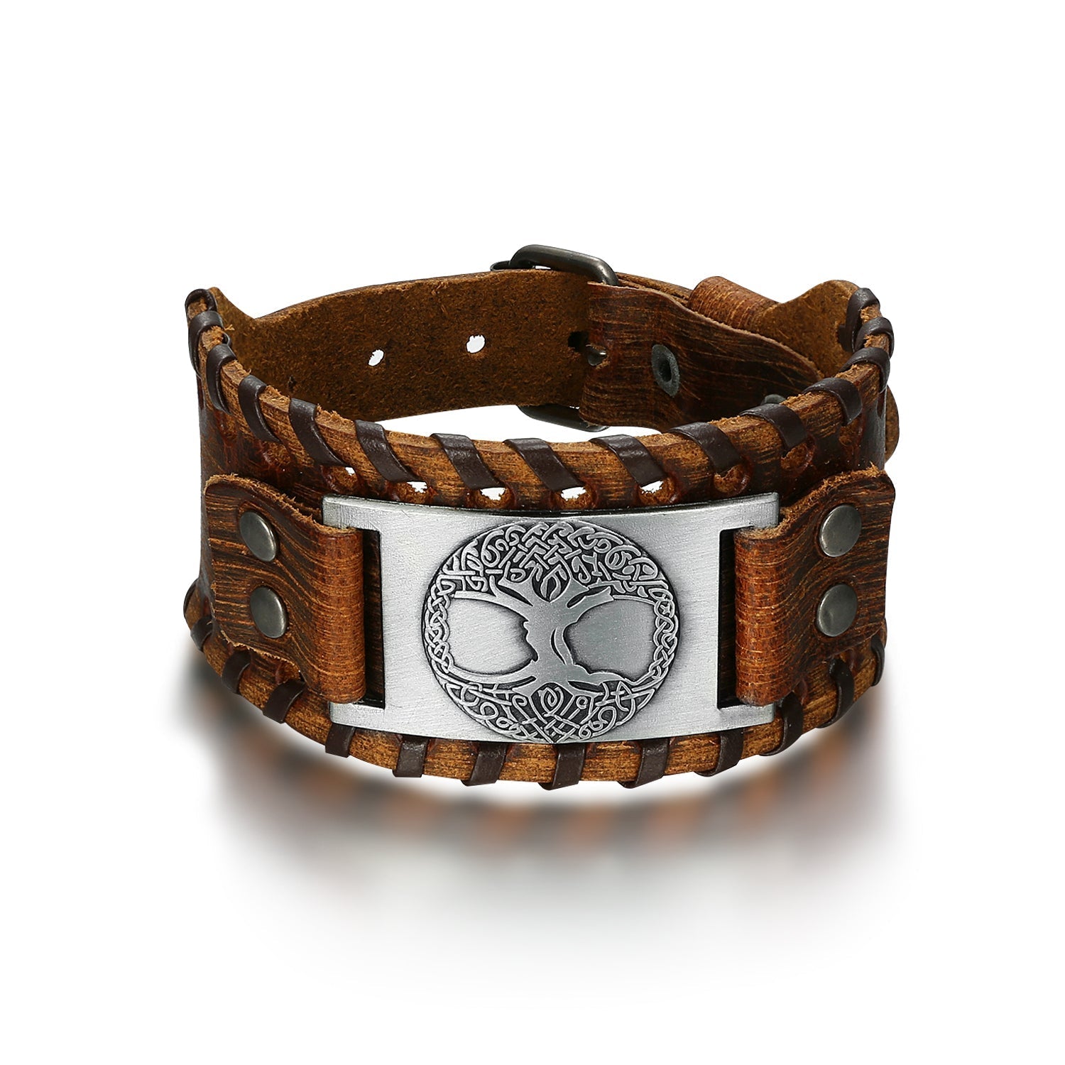 Nordic Pride Leather Buckle Arm Cuff With Metal Celtic Tree of Life Design