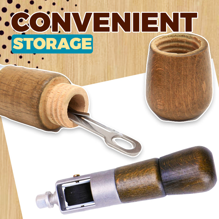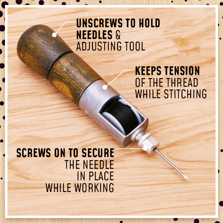 COMFORTABLE GRIP: Piercing needle and waxed thread held inside the wooden handle for a comfortable grip.