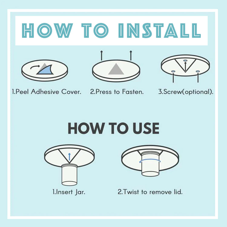 - EASY TO INSTALL. To install simply peel adhesive from back of the jar opener and firmly place disk in desired space.